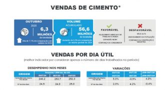 As vendas de cimento em outubro totalizaram 6,3 milhões de toneladas, o que representa um crescimento de 7,1% em relação ao mesmo mês de 2024, segundo o SNIC