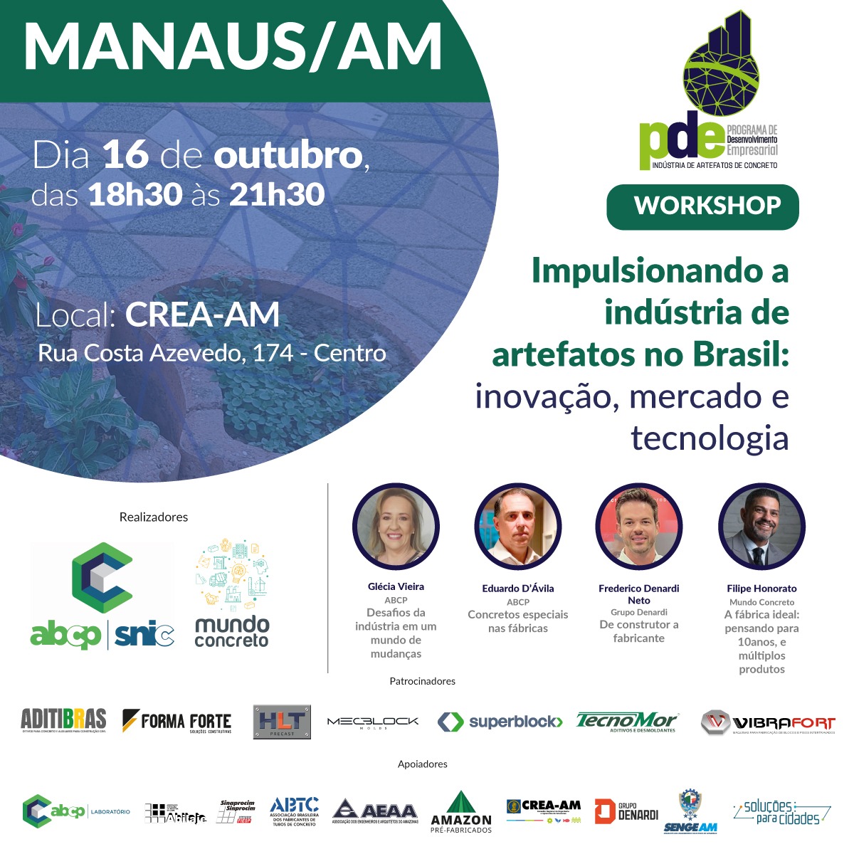 A ABCP, em parceria com o Mundo Concreto, está com inscrições abertas para o workshop “Impulsionando a indústria de artefatos no Brasil: inovação, mercado e tecnologia”, voltado para profissionais da construção civil. O evento acontece no dia 16 de outubro, das 18h30 às 21h30, no Conselho Regional de Engenharia e Agronomia do Amazonas (CREA-AM), em Manaus.