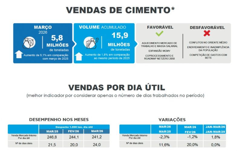A indústria brasileira de cimento registrou no primeiro trimestre a venda de 15,9 milhões de toneladas, o que representa uma alta de 1,8% em comparação ao mesmo período do ano passado, de acordo com o Sindicato Nacional da Indústria do Cimento (SNIC). Em março, a comercialização foi de 5,8 milhões, um aumento de 9,1% frente ao mesmo mês de 2025. Na comparação por dia útil, as vendas do produto registrar am 241,2 mil toneladas, uma retração de 1,2% em comparação a fevereiro.