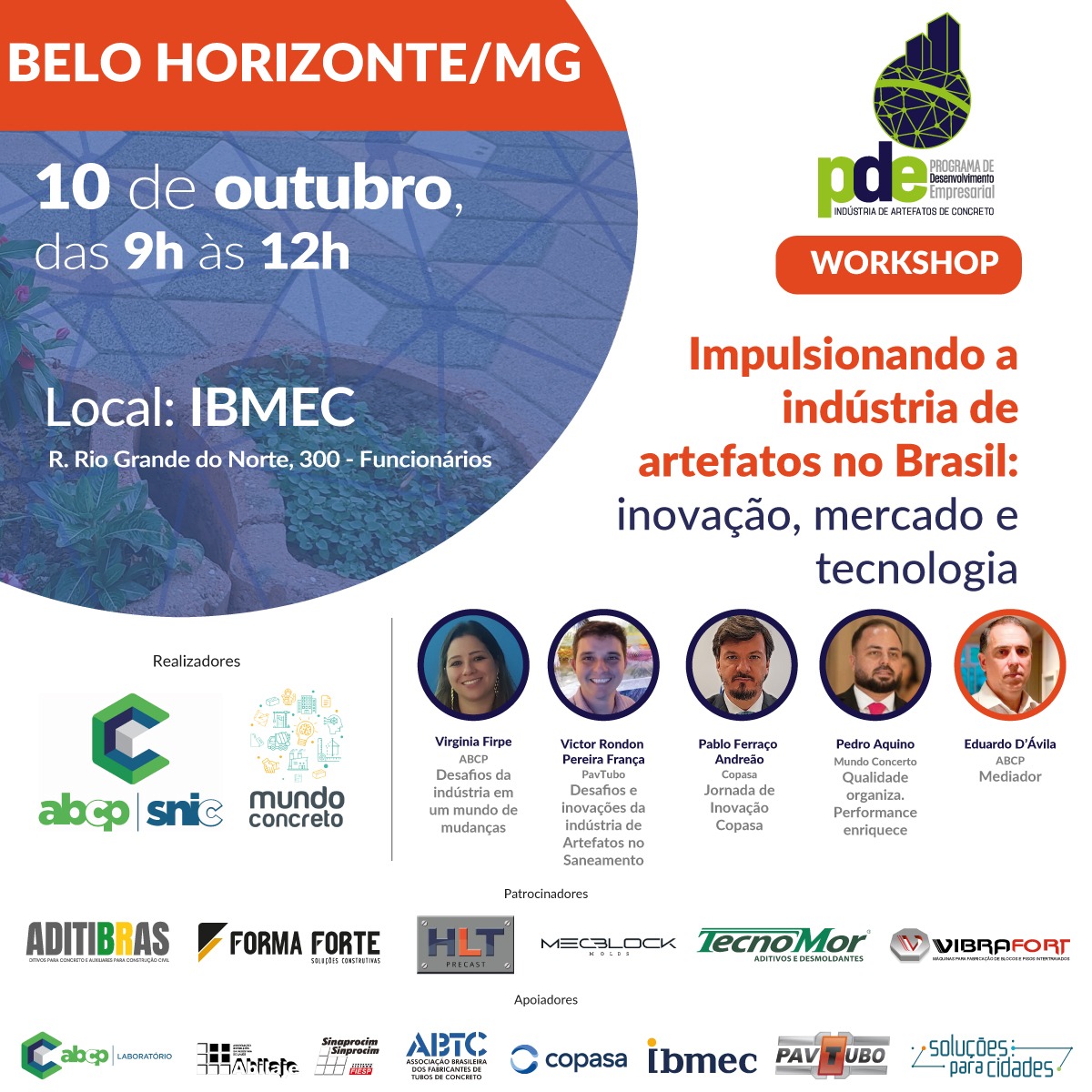 A ABCP, em parceria com o Mundo Concreto, abre as inscrições para o workshop “Impulsionando a indústria de artefatos no Brasil: inovação, mercado e tecnologia”, voltado para profissionais da construção civil. O evento acontece no dia 10 de outubro, das 9h às 12h, na Ibmec, em Belo Horizonte. O workshop tem como tema principal o impulsionamento da indústria de artefatos de concreto no Brasil através da inovação, tecnologia e mercado.